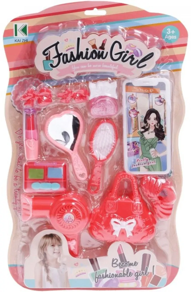 Obsahuje: Kabelku, fén, hřeben, zrcátko, make up, rtěnku, voňavku, skřipec do vlasů a sponky, mobil.