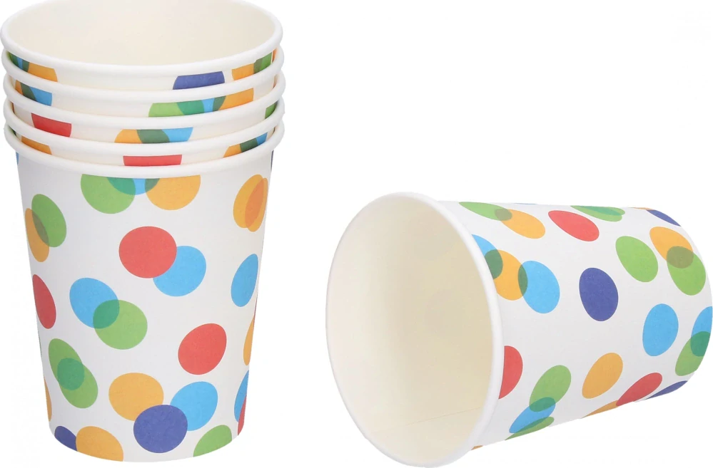 Papírové párty kelímky TEČKY o velikosti 250 ml. Balení obsahuje 6 ks.